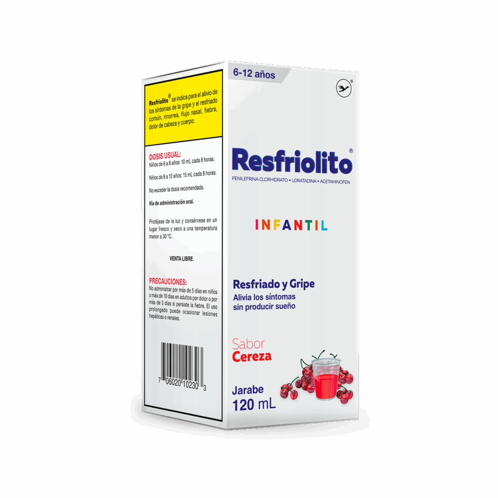 Resfriolito® Infantil es un medicamento que combina tres principios activos: la Fenilefrina clorhidrato ayuda a aliviar la congestión nasal, ya que contrae los vasos sanguíneos, la Loratadina es un antihistamínico de acción prolongada, que ayuda a aliviar el prurito, estornudos, congestión y goteo nasal, sin producir sueño y el acetaminofén posee efecto analgésico (alivia el dolor) así como antipirético (reduce la fiebre).